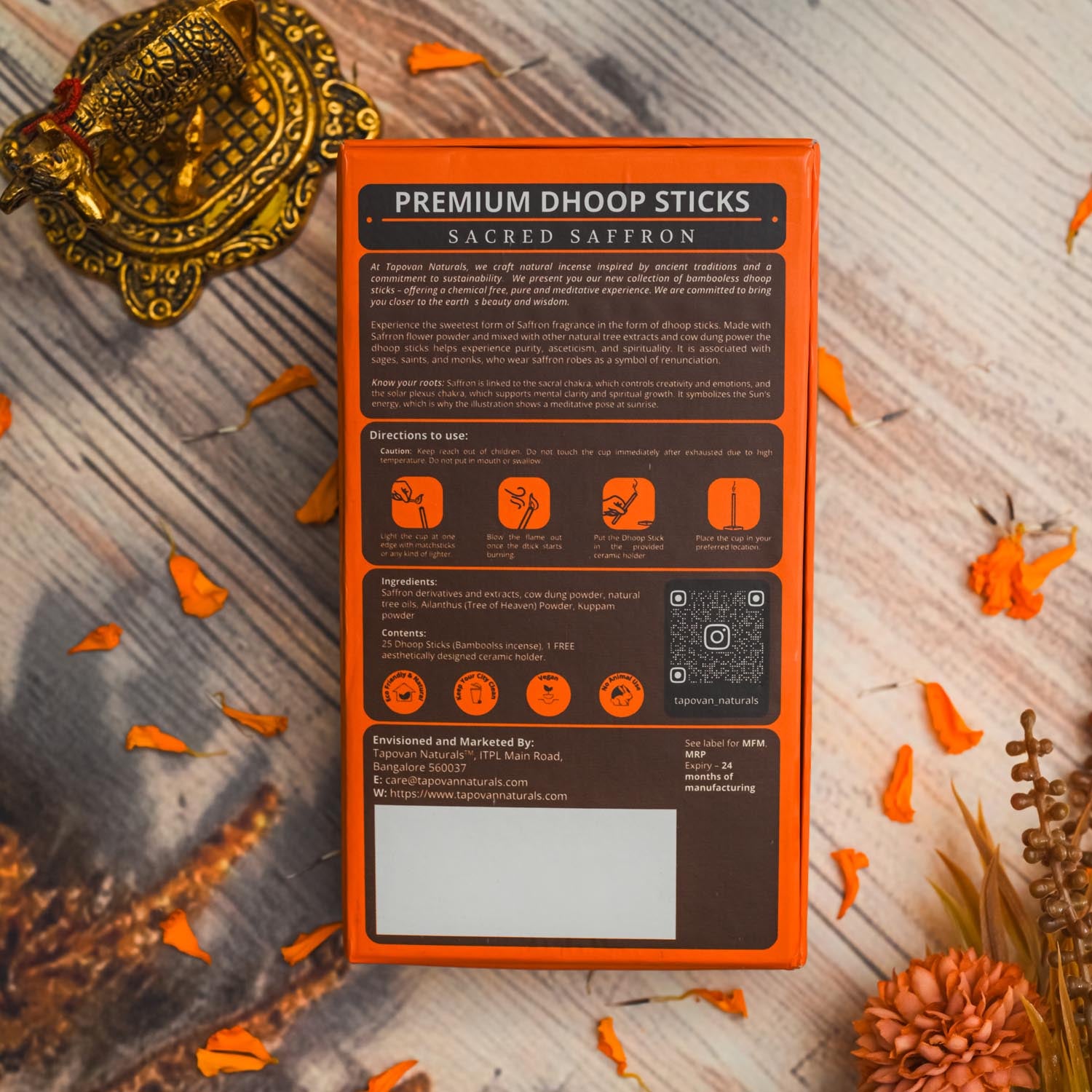 Made with natural ingredients like Saffron derivatives and extracts, cow dung powder, natural tree oils, Ailanthus (Tree of Heaven) Powder, Kuppam powder.