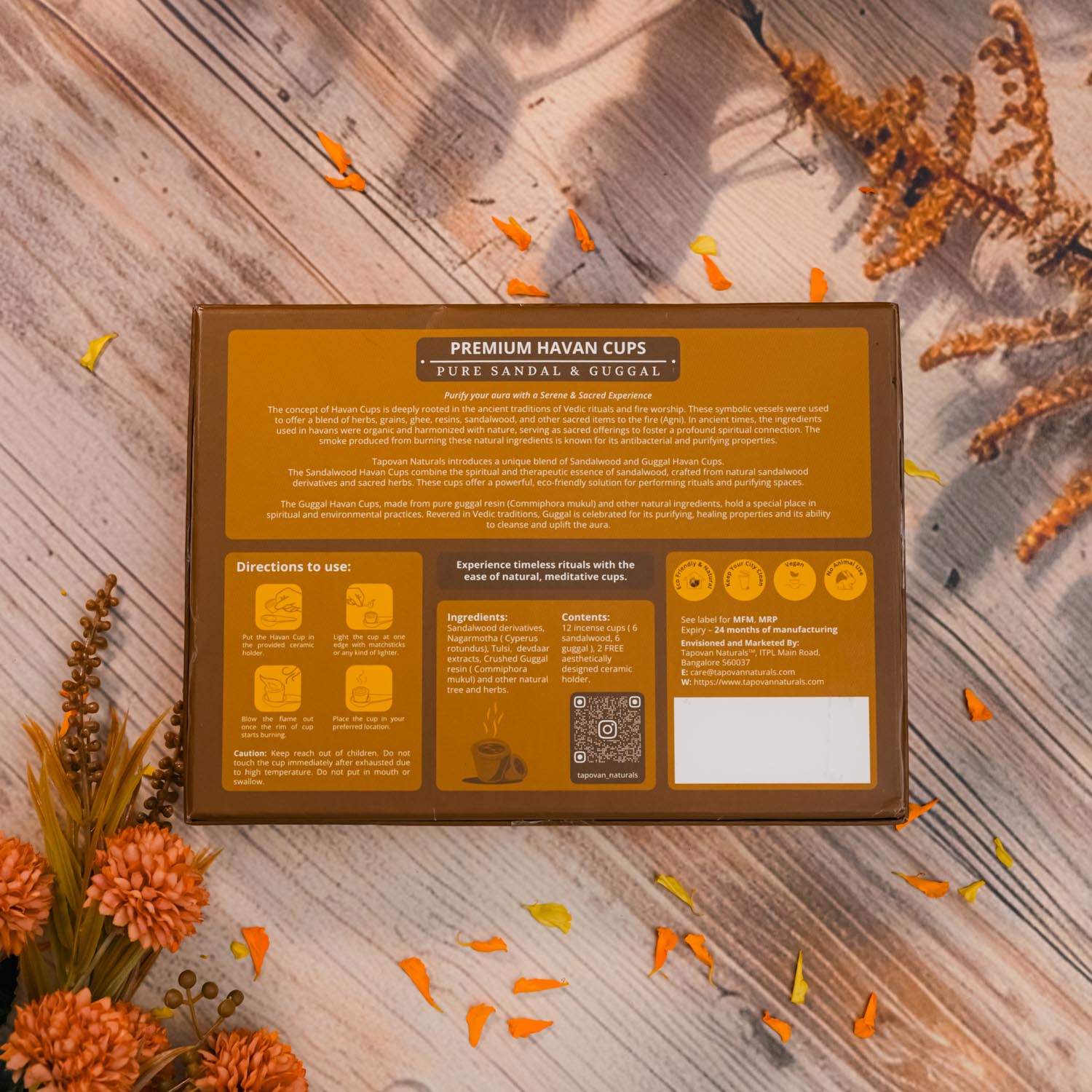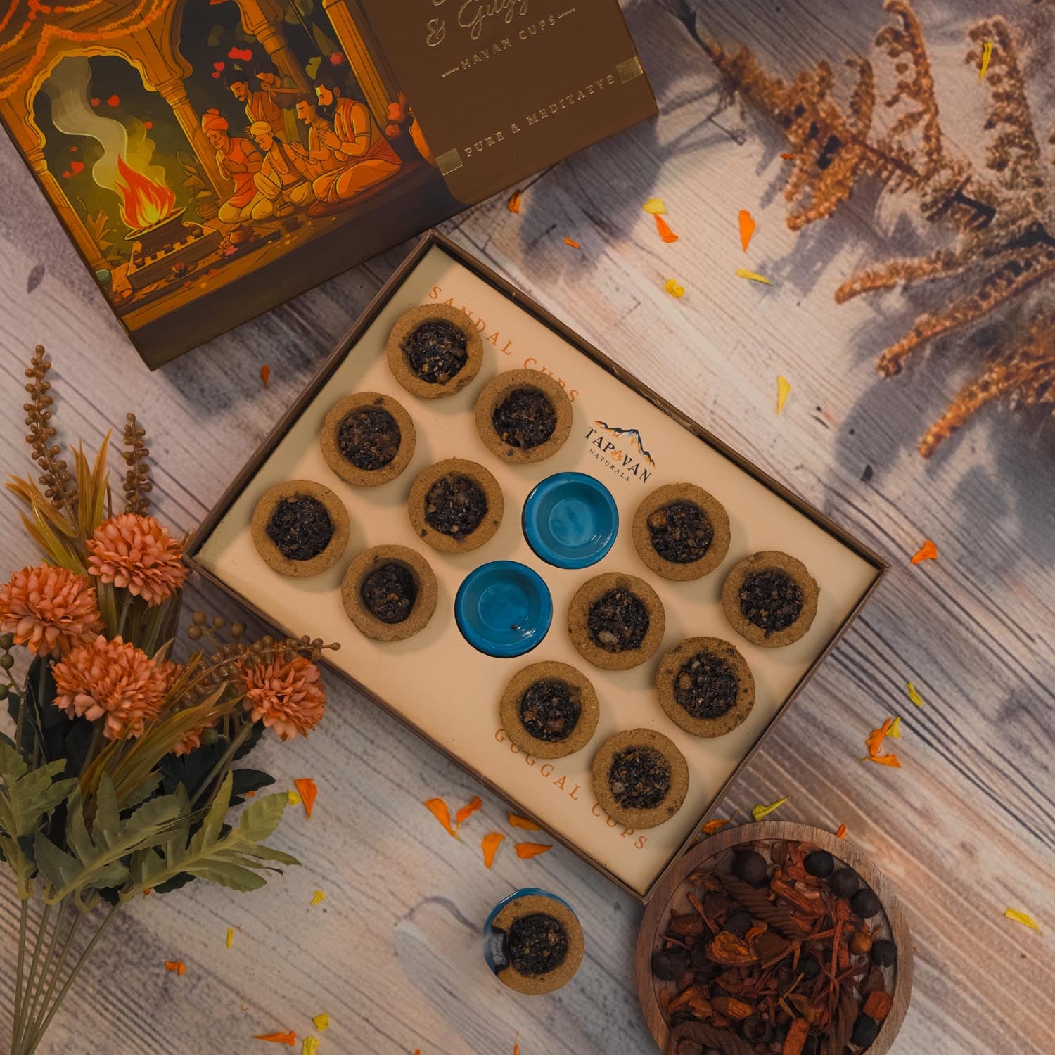 Tapovan Naturals presents an unique blend of Sandalwood and Guggal cups. Sandal havan cups combine the spiritual and therapeutic qualities of sandalwood, crafted from natural sandalwood powder, oil and sacred herbs. They provide a powerful and eco-friendly solution for performing rituals and purifying spaces. Whereas Guggal cups made from guggal resin and other natural ingredients, are widely valued in spiritual and environmental practices. Guggal (Commiphora mukul) is a revered herb in Vedic rituals, known for its purifying and healing properties and its power in cleansing aura.